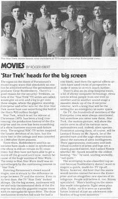 This was the most exciting thing that had come out about the movie so far, and I was thrilled beyond words. The fact that this was an event is demonstrated by the press coverage on the filming a full year away from the release. Below is the article that was inside. If you saw this years ago, I hope it brings back some memories. Some of that excitement is coming back now as the characters from the show are finding new life in the JJ Abrams movie, the trailer for which is now out and making waves, the like of which hasn't been seen since the days leading up to the unveiling of Star Trek: The Motion Picture.